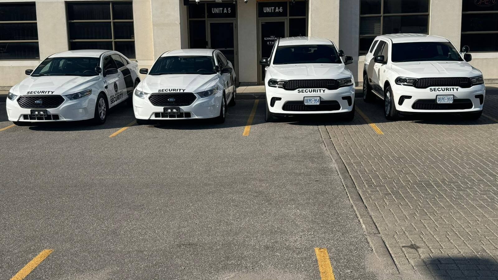 Marked vehicles perform randomized or scheduled patrols, door/window checks, and foot sweeps